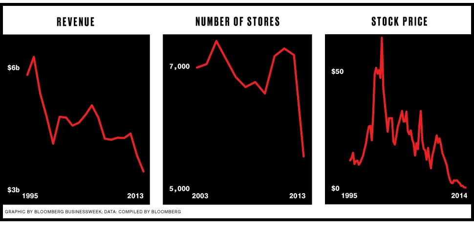 所以RadioShack也一样。这家公司的财务状况多年来一直不稳定,最终崩溃了。2月2日,彭博新闻报道该公司正在通过破产协议准备永久关闭,其中国际电话公司Sprint将接管一半的商店,其余的将被关闭。虽然谈判可能会破裂,条款可能会改变,但最终的结果似乎已经到来。自2011年第四季度以来,RadioShack已经亏损了9.36亿美元,那是它最后一次盈利。自15年前达到峰值以来,其股票价值已损失99.6%。纽约证券交易所在2月2日表示,正在暂停该公司股票的交易,并准备将其退市。RadioShack最近的唯一亮点是在去年的超级碗期间播出的一则有趣的电视广告,当时公司自嘲自己停留在1980年代。(到年底,公司已经削减了广告预算,首席营销官也离职了。)