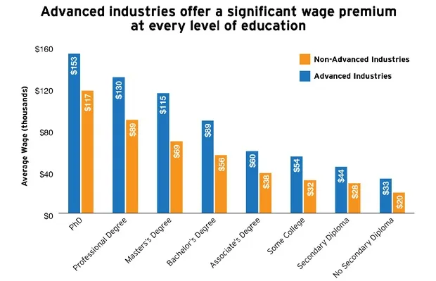 在这些领域,没有高中毕业文凭的工人平均收入比非先进行业的工人高出65%。拥有学士学位的工人这一差距缩小至59%,拥有硕士学位的工人则扩大至67%,而拥有博士学位的工人再次缩小至31%。显然,工作在这些行业的人与不在这些行业的人之间的薪资差异是显著的。