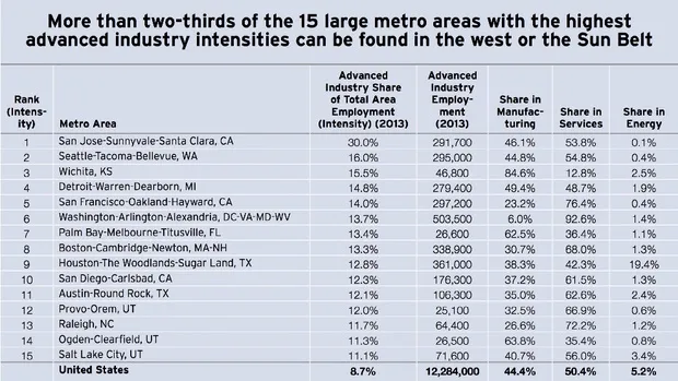 圣荷西(硅谷)领先,30%的总就业岗位在先进产业部门。其他在前20名中的主要大都市大多是科技中心:西雅图、旧金山、华盛顿特区、波士顿、圣地亚哥、奥斯丁、罗利和盐湖城。但一些不太可能的城市也出现在名单上,比如底特律,因其先进的汽车技术;堪萨斯州威奇托的飞机制造中心;佛罗里达州棕榈湾的通信中心(哈里斯公司的总部);新兴IT明星南卡罗来纳州查尔斯顿;以及休斯顿的能源复合体。