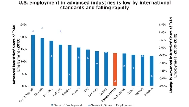 另一方面,美国在先进产业的就业规模和其在总经济中所占的产出方面竞争力较弱。2000年至2010年间,美国的先进产业就业岗位下降幅度超过任何其他可比国家。正如下方图表所示,它现在落后于捷克共和国、德国、匈牙利和芬兰等国家。