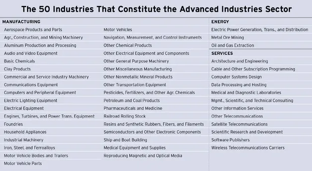 报告中识别的先进产业(见下表*)包括技术驱动的制造业(制药、汽车制造、化学品等)、能源(矿石开采和天然气开采)和服务(管理和科学咨询、建筑、软件等)行业。