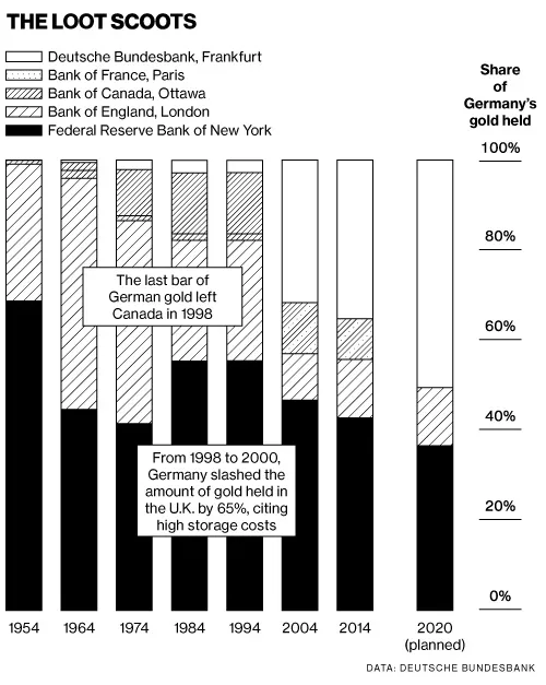 战后,全球贸易围绕着美元展开,而美元是以黄金为支持的。在这种安排下,任何国家都可以随时将其美元兑换成金条。随着西德经济的腾飞,该国在1950年代和1960年代出现了贸易顺差。德国公司将他们的美元兑换成德国马克,填满了新的德国联邦银行的美国货币。中央银行反过来又在纽约联邦储备银行将美元兑换成黄金,增加了其在自由街的储备。这一切在1971年结束,当时理查德·尼克松总统暂停了黄金兑换,使美元成为一种“法定货币”,仅仅依靠公众对美国的信心。在冷战期间,将黄金保留在曼哈顿而不是法兰克福(距离铁幕75英里)是有意义的,以防苏联入侵。然而,即使在1989年柏林墙倒塌后,黄金仍然留在纽约。或者说,德国人是这么被告知的。