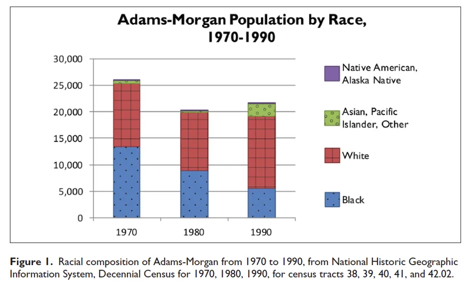 到1970年代初,开发商开始在亚当斯摩根购买大块土地——在某些情况下是整条街——并进行翻转。逐渐地,这些努力挤出了非裔美国家庭。从1970年代到1990年代,该地区的黑人占人口比例从52%下降到26%。