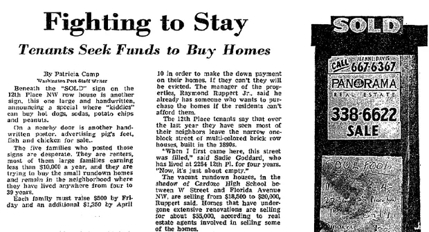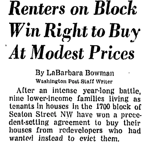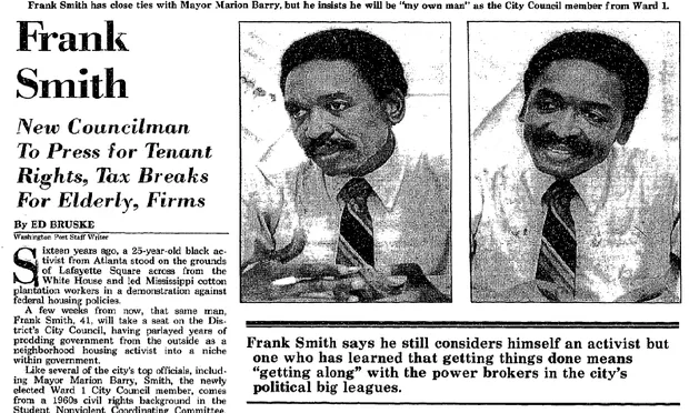弗兰克·史密斯帮助华盛顿特区的租户争取购买他们的房屋。ProQuest历史报纸档案/《华盛顿邮报》,1982年11月17日史密斯利用了华盛顿特区1974年租金控制法中一个当时较新但仍然有些模糊的“优先购买权”条款,为他的团体谋取利益。根据该立法,如果房东决定出售房屋,租户有权匹配该物业的报价并购买它。亚当斯摩根组织在1976年代表23个未被提供此权利的家庭对开发公司提起了两起诉讼。