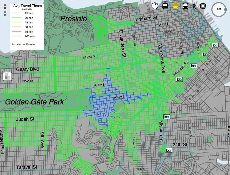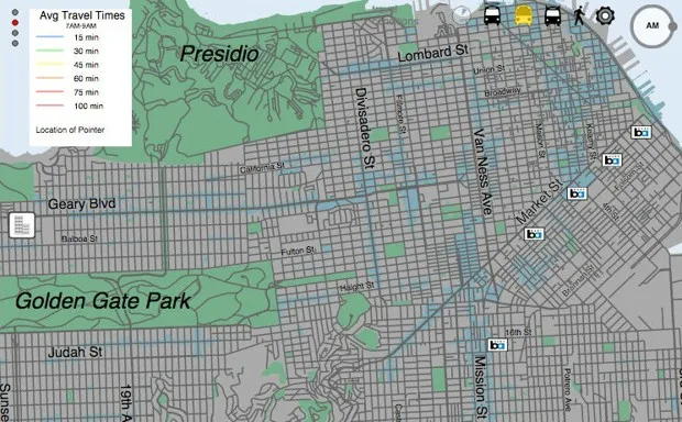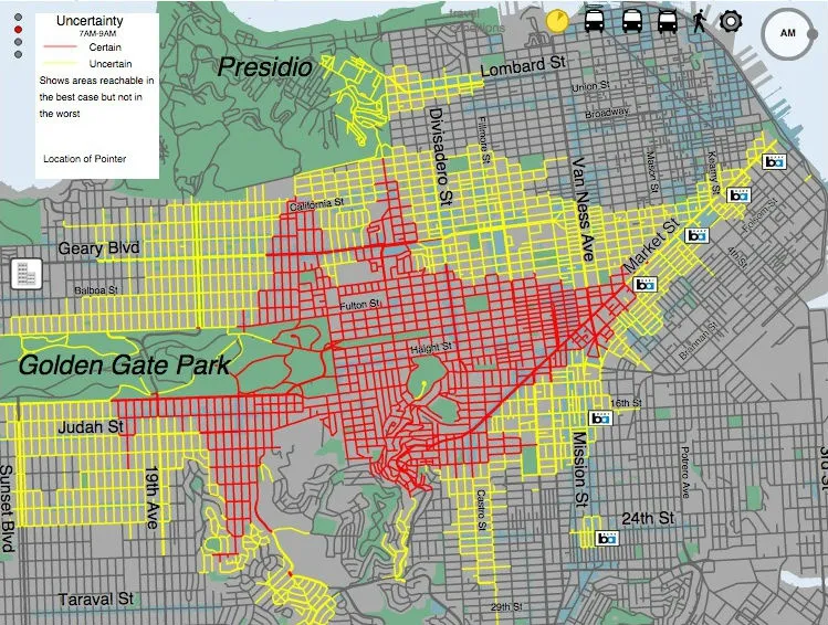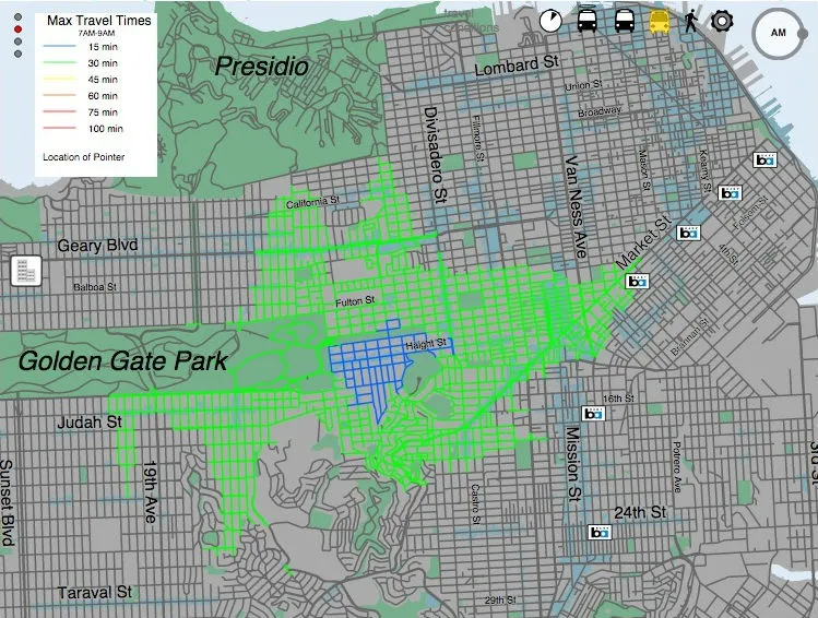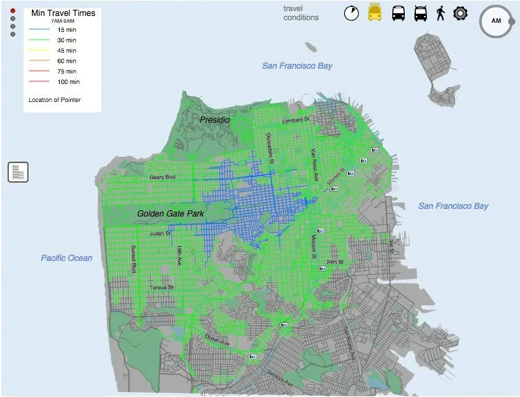 交通规划者和学者们对无车通勤排名基于可达性的地图进行了大力推动,因为越来越多的服务数据可用。旧金山的互动工具提供了比大多数其他努力更高的精确度,因为它分析了真实的过去表现,而不是依赖于计划的表现。当与地理空间数据叠加时,例如,工作、收入甚至健康食品的杂货店,这种地图变得特别有用。
