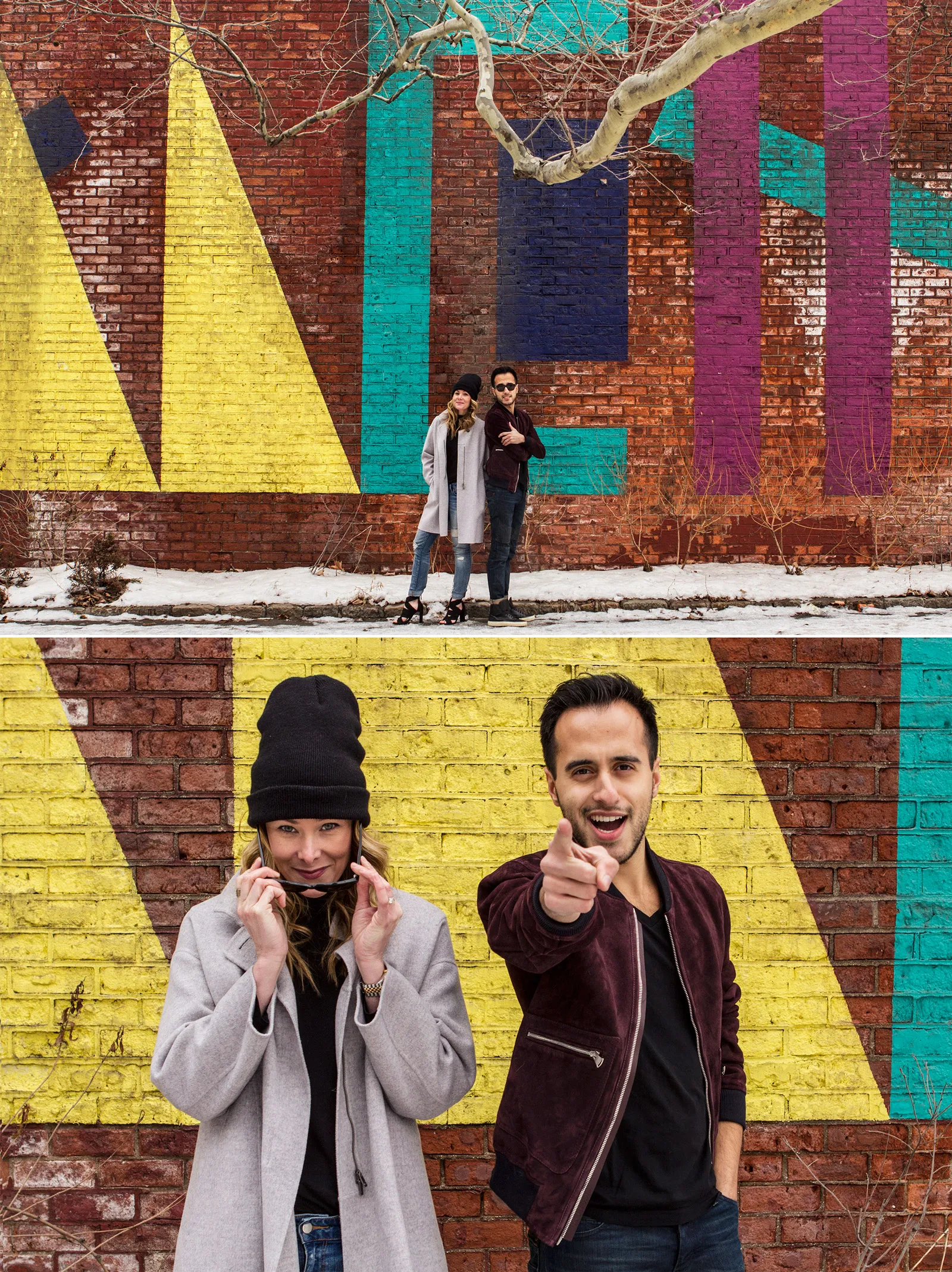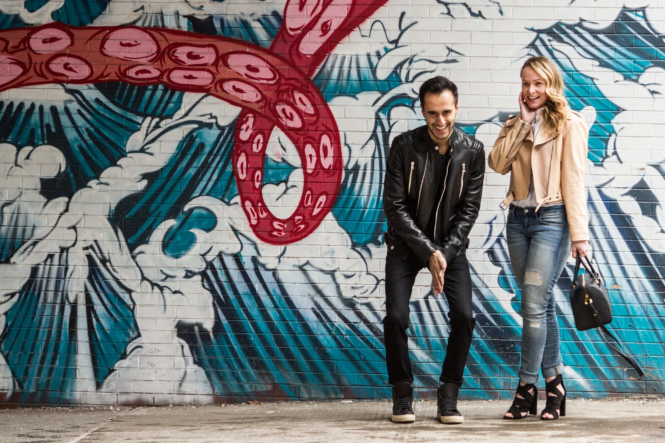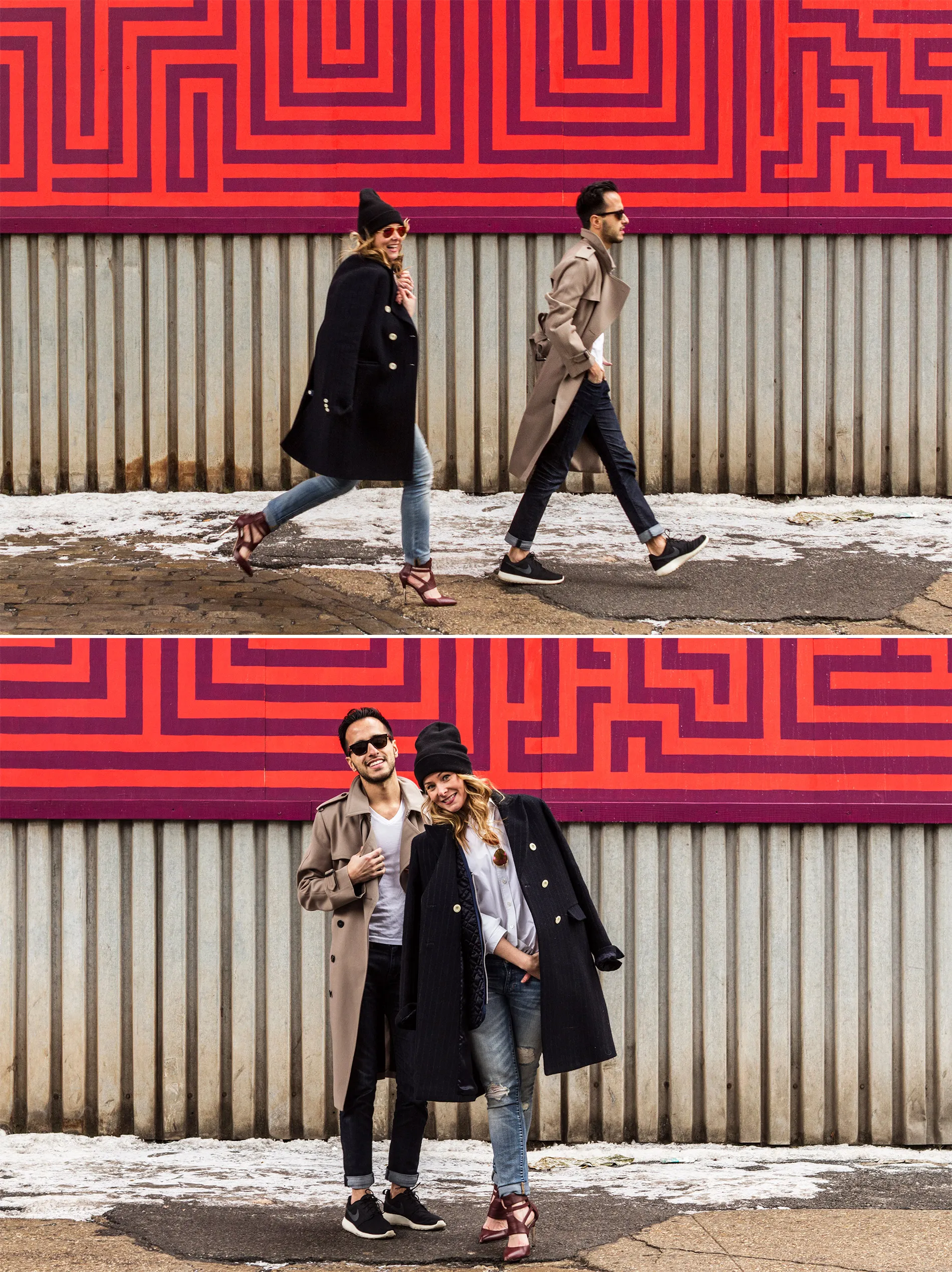 这幅由布鲁克林艺术家 gilf! 创作的催眠迷宫壁画装饰了Dumbo的 Front Street。Nic和Moti并不试图争夺注意力,而是坚持干净的线条和基本的颜色,穿着一件由Sacai设计的黑色双排扣外套($1,720)和一件经典的圣罗兰风衣($2,990)。