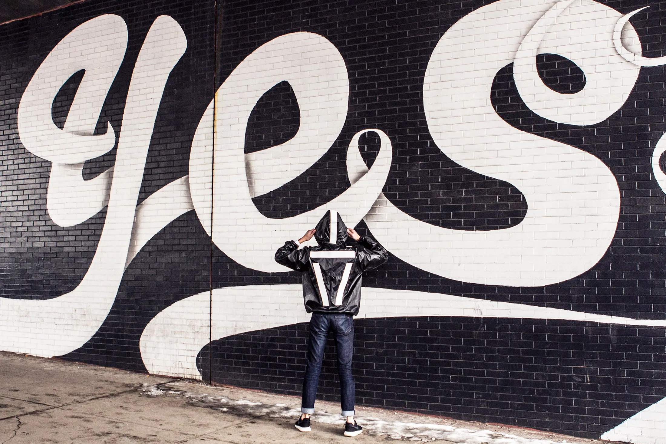 纪梵希的声明风衣($1,500)几乎与 Stefan Sagmeister的图形文本壁画(由 Coby Kennedy 手工绘制)相匹配,位于 布鲁克林-皇后区高速公路下方。