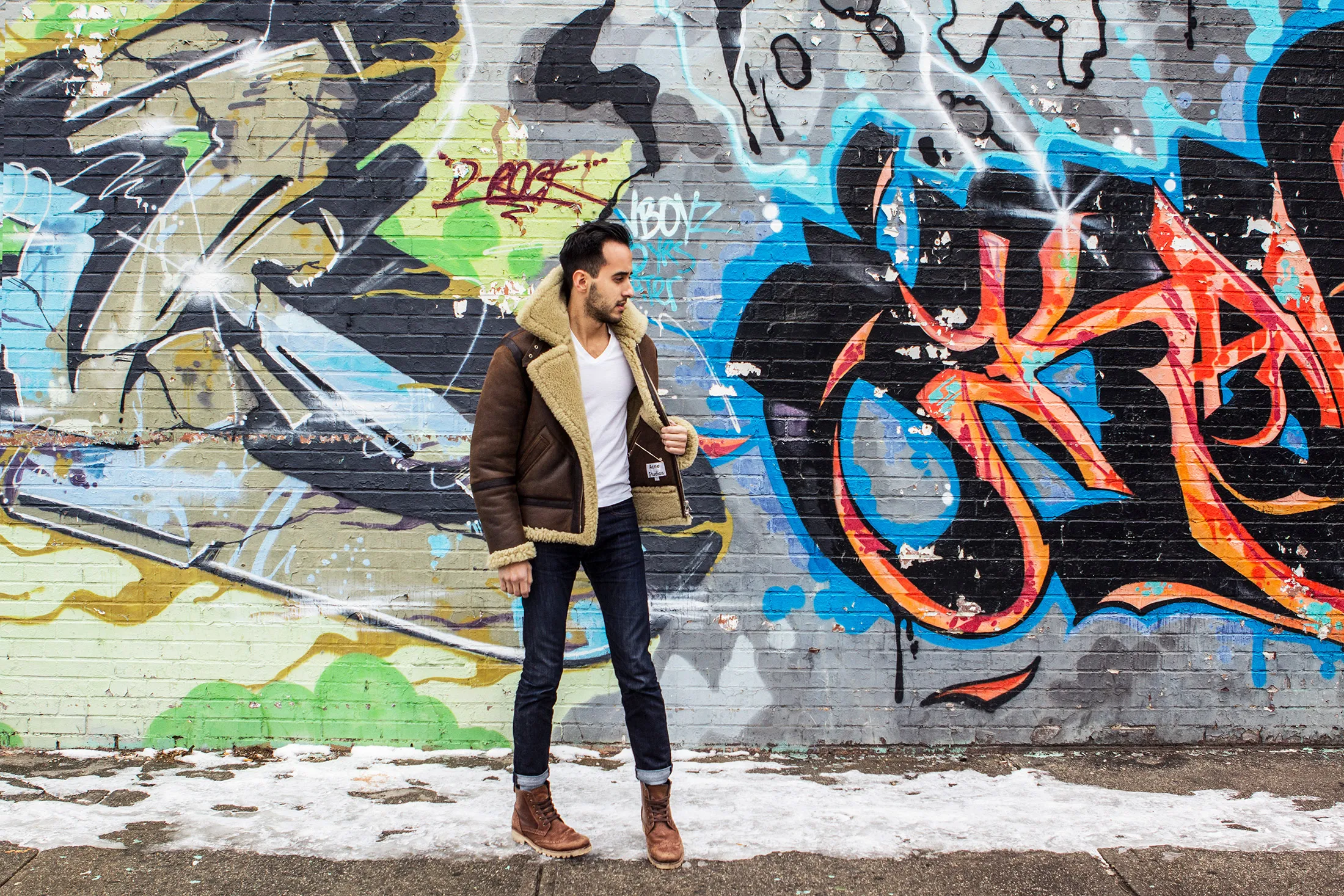 有时候,将一件笨重的物品,比如这件Acne羊羔毛夹克($2,700),与一件简单的T恤搭配是很不错的选择。我们让Moti在Revs的混乱壁画前展示这个组合——尽管天气寒冷——在Bridge和York的拐角处。