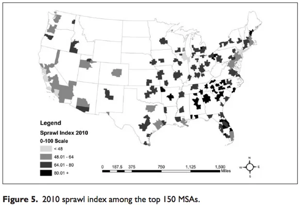 这个新的城市扩张指数不仅提供了城市扩张的程度和成本的额外证据,还表明美国继续分化为两个国家的程度:一个更密集、更昂贵、更受教育和更健康,另一个则更分散和更可负担(尽管财富较少),但污染更严重且健康状况较差。