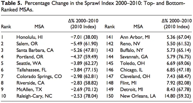 LaidleyLaidley指出,城市扩张最少的城市——那些实际上变得更密集的城市——是那些受到所谓“增长控制”政策限制的城市。俄勒冈州是最早引入城市增长边界的州之一,其两个城市在前十名中:塞勒姆和波特兰。檀香山、圣巴巴拉和西雅图的外部增长也受到增长控制政策的限制。