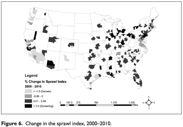 下一张地图(也来自Laidley的研究)描绘了2000年至2010年间城市扩张的变化。根据城市扩张指数的测量,整个国家在此期间变得更加扩张,国家的总体测量从2000年的57.9增长到2010年的59.4。