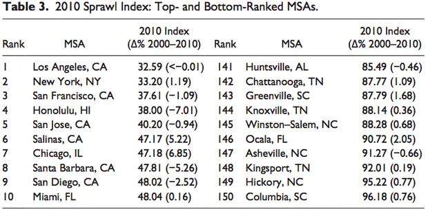 莱德利上面的地图来自莱德利的论文,基于2010年的数据,绘制了他在美国150个最大城市中的扩张指数。下面的表格列出了他扩张指数中排名最高和最低的城市。