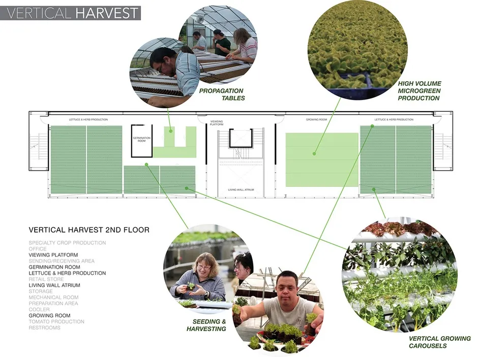 文章继续在下面根据联合创始人和建筑师诺娜·耶希亚的说法,她的公司 E/Ye Design 开发了该项目的建筑愿景,Vertical Harvest 的独特之处在于它结合了这两种垂直农业的方法。它本质上是三个温室叠加在一起。每个独立的层将种植不同的作物,前两层看起来更像传统的单层温室。顶部和最高的层将类似于其他现有的垂直农场。它将使用旋转的旋转木马来移动植物,实际上增加了一个第四层。