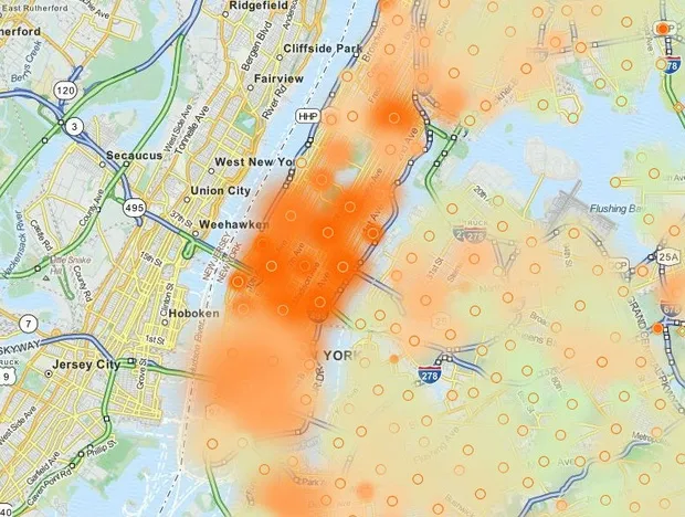 Move NY引用热图显示东河桥附近交通事故的高发率。纽约市事故地图纽约的道路质量也在下降。Move NY指出以下几条几乎不太有趣的安全事实:截至2013年,约12%的州桥被分类为“结构性缺陷”;30%的城市道路处于“一般”或“差”状态(比2000年的16%有所上升),而位于城市的51%的州高速公路车道处于“一般”或“差”状态(比2008年的38%有所上升)。哦,超过一半的MTA桥梁和隧道都超过70年历史。