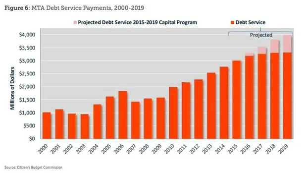 MTA的债务正变得不可持续。Move NY更糟糕的是,MTA的债务正在快速增长。Move NY指出,债务服务占该机构2014年运营预算的17%;这意味着纽约人每支付1美元的过路费和票价,就有17美分流向债权人,而不是交通系统。如果MTA借款以满足其资本计划的资金需求,过路费和票价预计需要上涨15%——在计划中的4%涨幅之上。