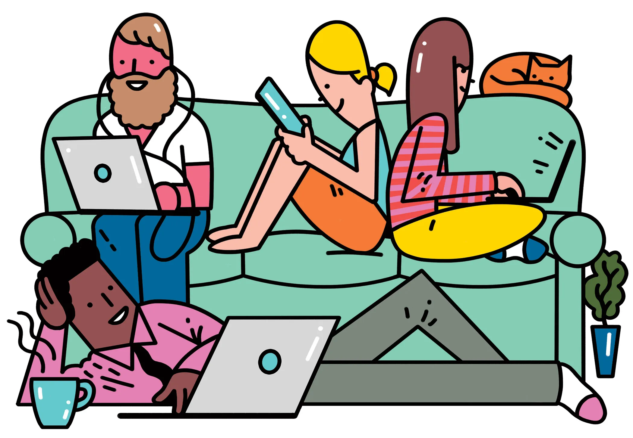 插图:萨姆·艾斯兰在斯德哥尔摩的一间公寓里,两个人坐在一张浅色木餐桌旁,敲打着他们的笔记本电脑。还有两个人坐在厨房里一张类似的桌子旁。一名男子靠在椅子上,手里拿着笔记本电脑,双脚放在一个小脚凳上。气氛很温馨,书架上杂乱无章,还有一壶新煮的咖啡。看起来像是宜家的目录,但其实不是,这些人都不住在这间公寓里。他们只是把这里当作办公室,参与一个叫做Hoffice的联合办公运动。