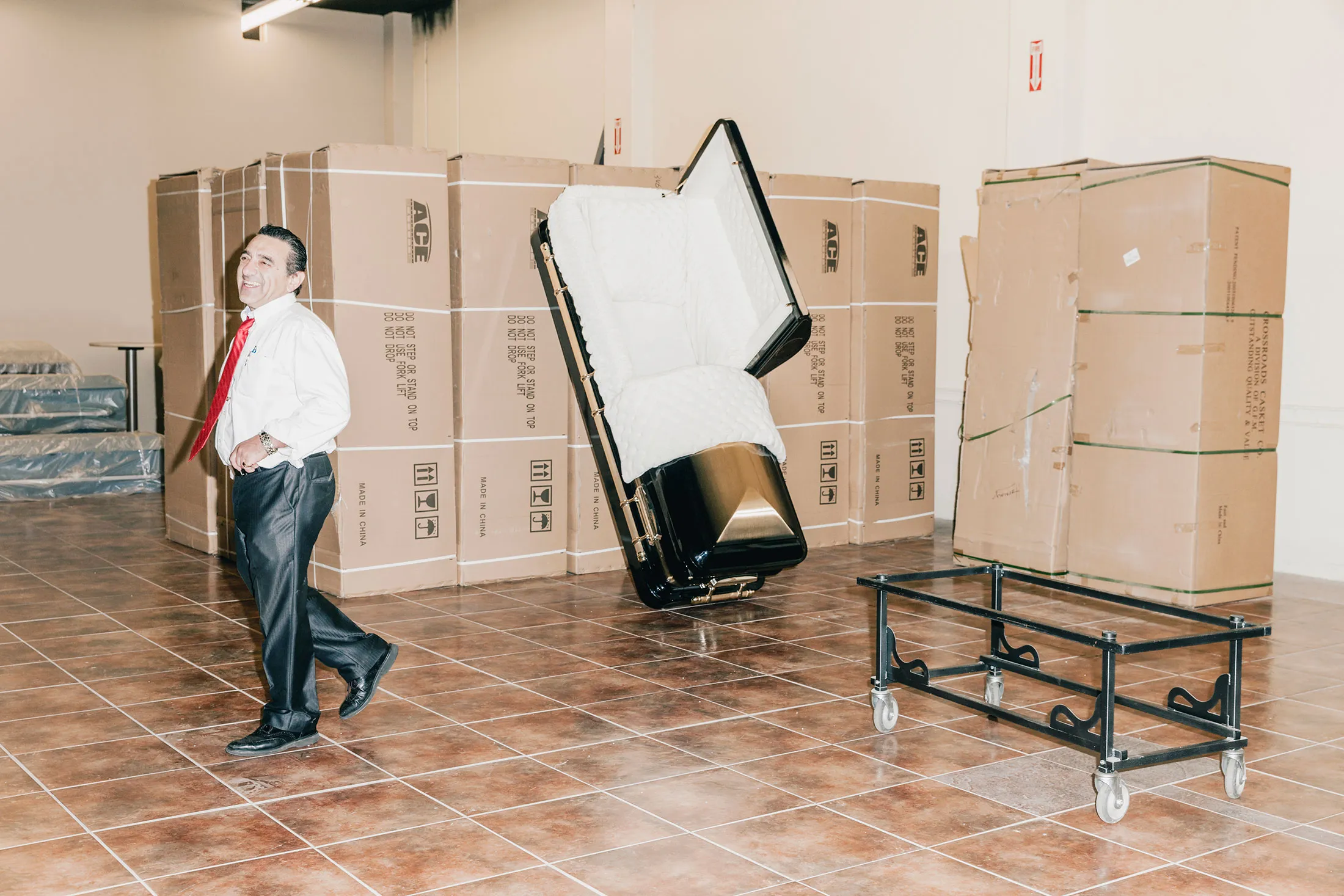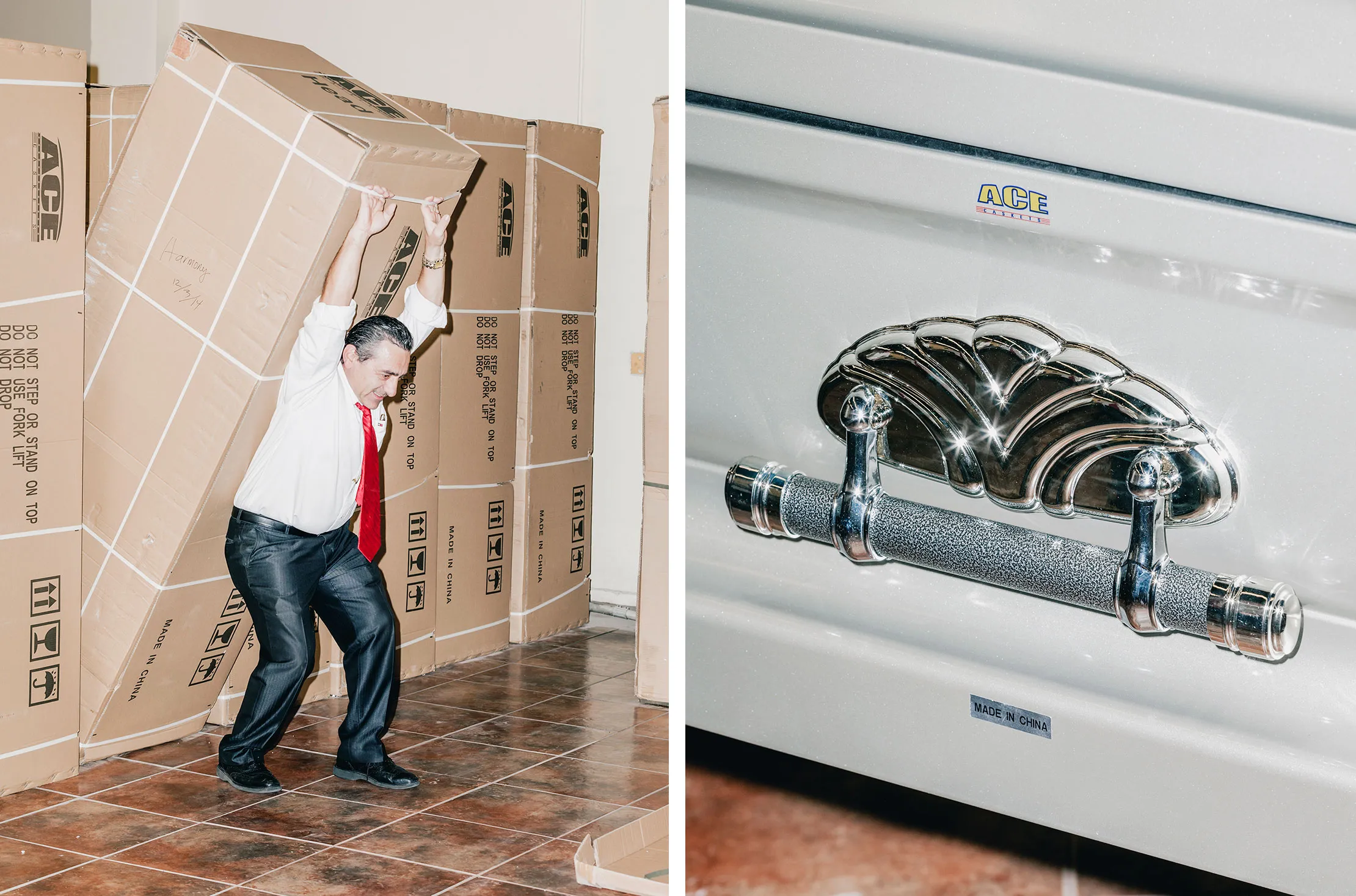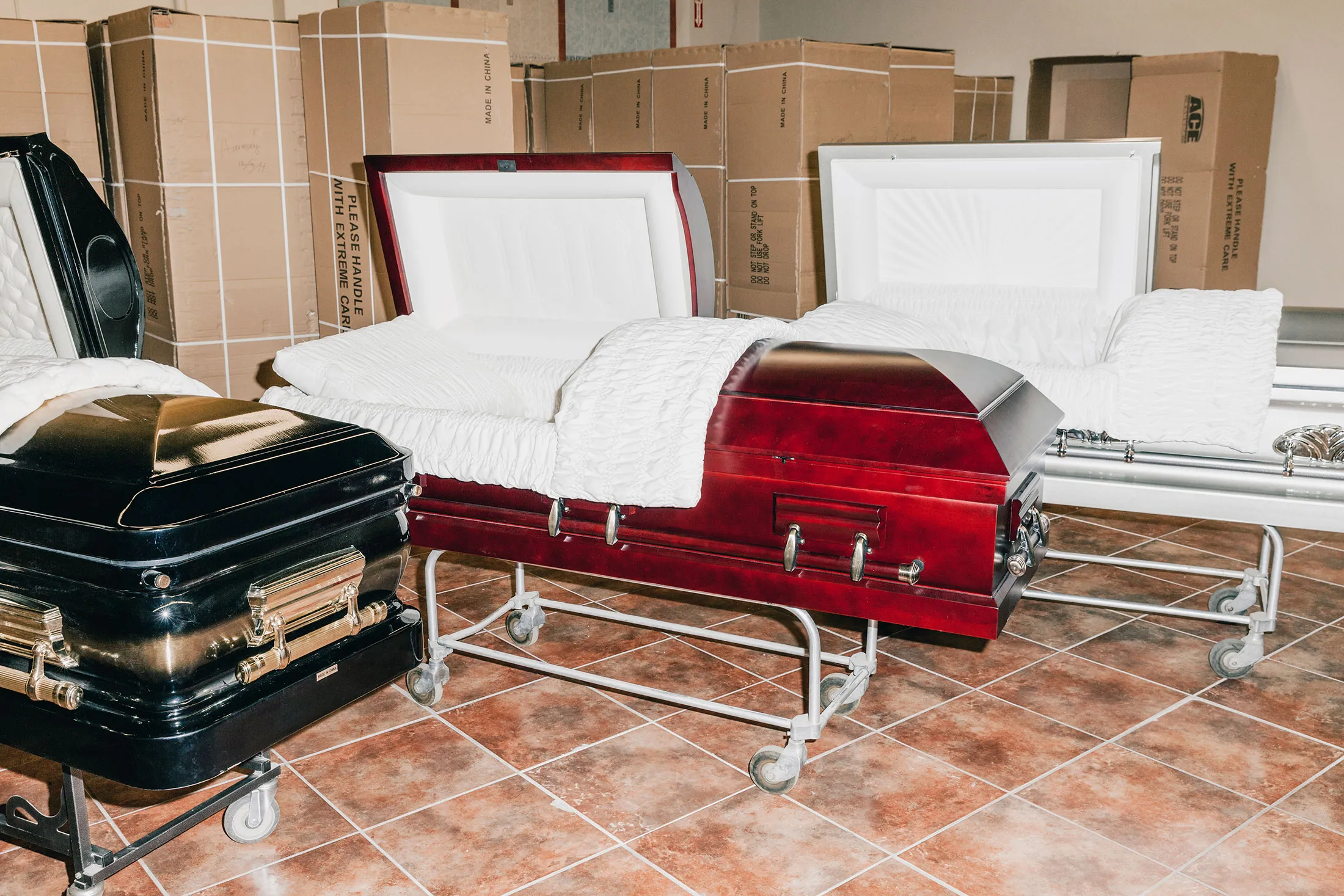 ACE客户需要做更多的规划:一个40英尺的集装箱从工厂到殡仪馆需要六到八周的时间——在中国假期期间更长。殡仪馆主任每年需要至少进行150个电话才能证明进口一个集装箱是合理的。White & Day每年处理大约500个电话。为了确保Malamas的商品有稳定的库存,该公司去年在加利福尼亚州雷东多海滩的太平洋山公墓扩建了一个储藏棚,并在附近的加登纳的殡仪馆火灾后重建了一个更大的仓库。在最近的一个冬天,这两个设施大约存放了225个ACE棺材,装在纸箱里,像巨大的多米诺骨牌一样排成一队,每个上面都印有“中国制造”和手写的型号名称及交货日期:优雅 1/23;和谐 12/3/14;宁静 12/3/14。