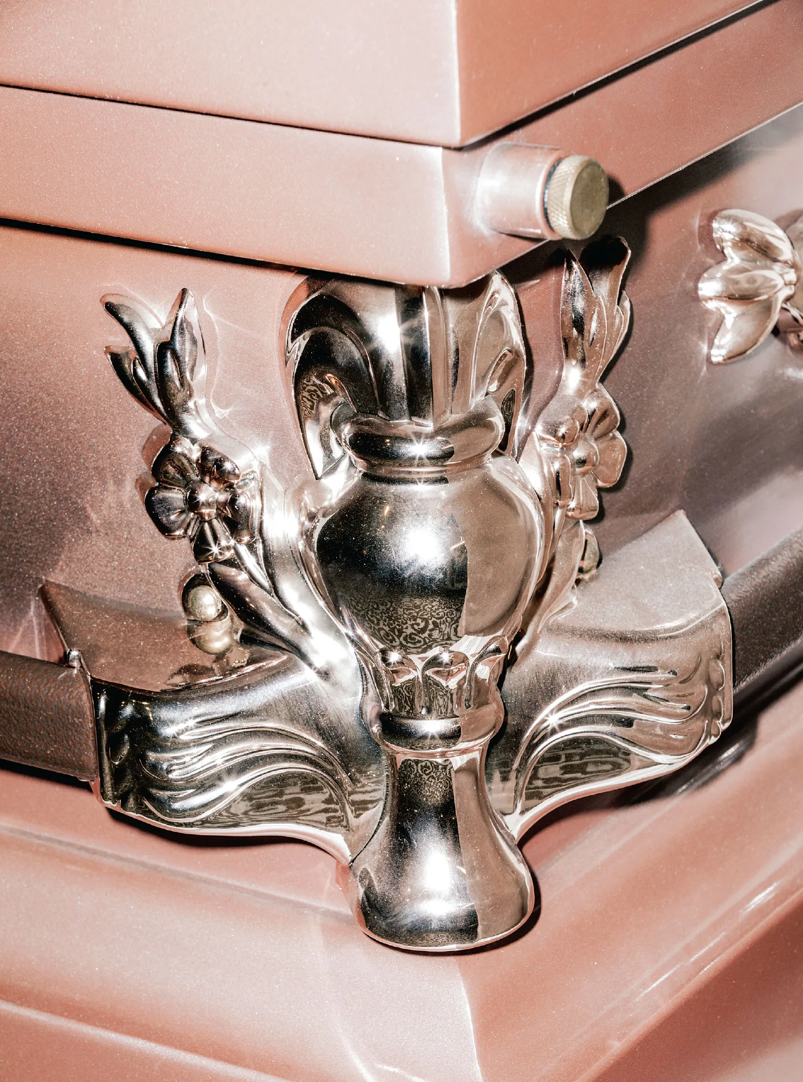 公司卡车是一辆老旧的U-Haul,马拉马斯对其进行了改装,装上了承重架。在后面放着一款北美最受欢迎的女性棺材的仿制品:Primrose,采用18号钢制成,内部为绉纱。三家主要的棺材制造商主导着市场,出售这种美国制造的产品,价格高达1500美元。马拉马斯在中国制造了几乎相同的型号,在网上宣传,并收取408美元。毕竟,这只是一具棺材;它只需要在一天内看起来不错。