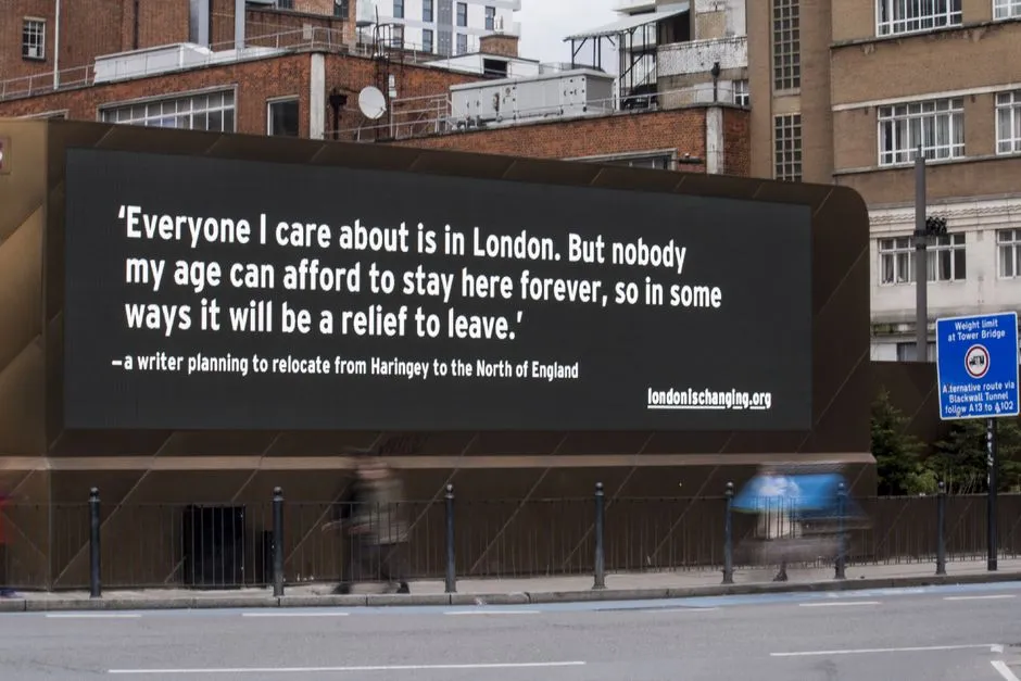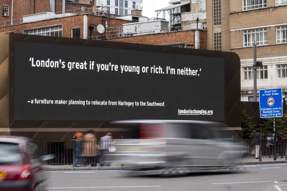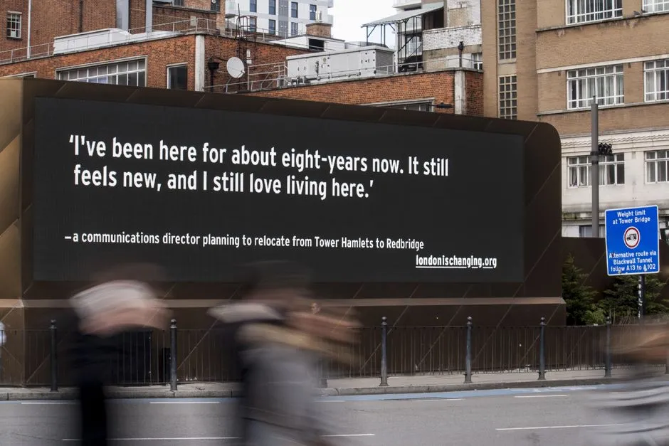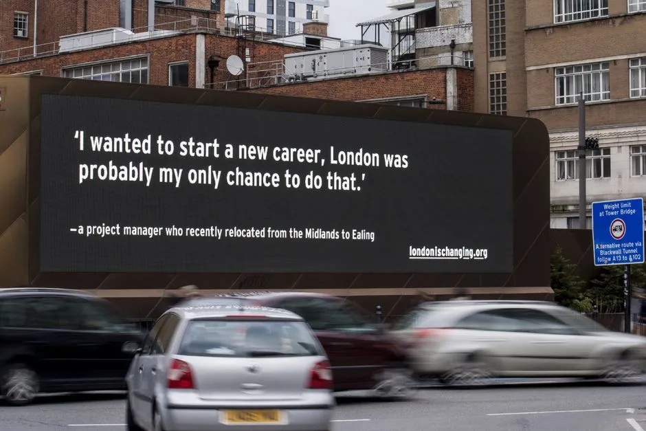 伦敦的广告牌分享了迁移的故事——无论是离开城市还是迁入城市。杜阿尔特·卡里略·达·格拉萨人们为什么选择搬到伦敦?他们为什么选择离开?一个探索这些问题的新项目目前正在一个不太可能的场所进行——在英国首都中心的两个广告牌上。这个名为“伦敦在变化”的项目通过一个 网站运行,邀请那些搬入、搬出或穿越伦敦的人分享他们迁移背后的原因和情感。这些信息随后会在广告牌上展示,希望能让路过的人在走路或开车时停下来思考。