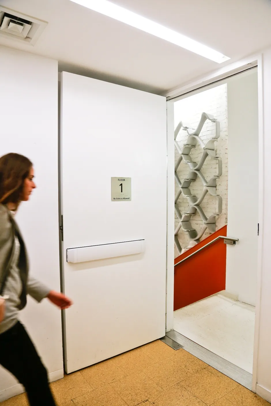 更具吸引力的楼梯,来自纽约建筑中心。艾米莉·杨还有更多戏剧性的干预选项。ULI在积极设计中心的原则指导下,认为开发商应该在施工队进场之前认真考虑楼梯。该组织建议将楼梯放置在比电梯更靠近建筑入口的位置,并使其更为显眼。(一项2007年的分析发现楼梯的可达性和可见性解释了其在10座大学建筑中使用的53%。)使用玻璃面板作为墙壁而不是混凝土和水泥块,也能温和地引导人们走向楼梯。