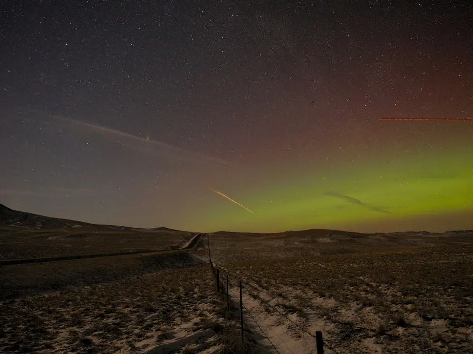 周一晚上,约翰·阿诺德驱车180英里来到蒙大拿乡村,拍摄极光的长时间曝光照片。在设置相机时,他恰好转过身,这时他看到了:一团巨大的火焰正朝他缓缓移动。