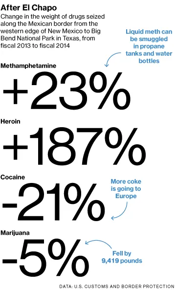 在包括埃尔帕索和华雷斯市的500英里边界线上,执法部门在2013年10月至2014年9月期间查获了247磅海洛因——几乎是前一年数量的三倍。处方药使用的新限制正在驱使更多美国成瘾者转向海洛因。国家安全分析师亚历杭德罗·霍普(Alejandro Hope)表示,后古兹曼时代的墨西哥毒品集团的分裂可能意味着更多的自由职业者正在尝试生产海洛因。“参与贩毒的人可能比锡那罗亚卡特尔更多,从而增加了供应,”这位前墨西哥情报官员说。