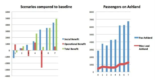 2013年9月的ITDP分析测试了七个连接Ashland和Central Loop的潜在服务计划。在旅行时间对乘客的好处和对交通机构的成本好处方面,最有前景的方案涉及一条S形路线,通过一辆沿Division Street继续行驶的快线巴士连接两个BRT线路(右下角,方案7)。该计划将显著增加沿Ashland的总乘客数量,特别是相较于现有的(0)和基本的BRT(1)设计。