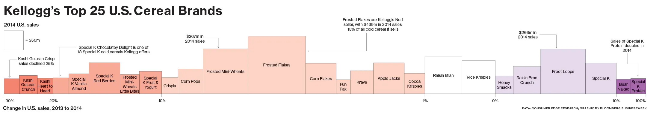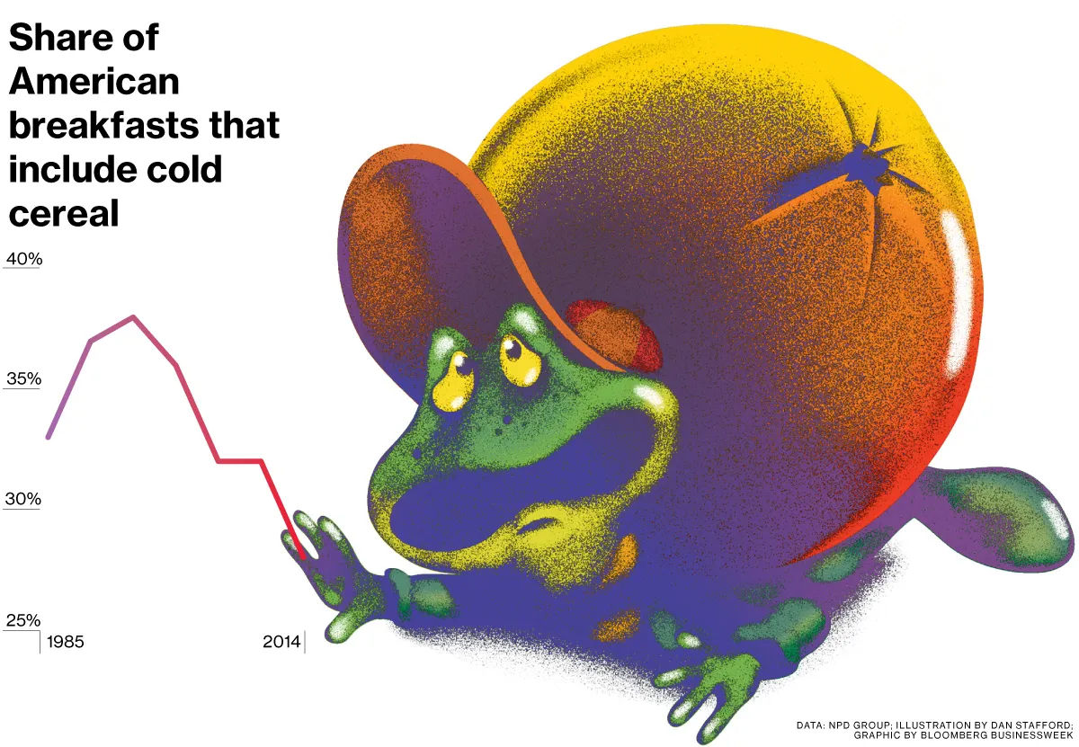 2月12日,布莱恩特在享用了他习惯的全麦麦片后,抵达位于密歇根州巴特尔克里克的凯洛格总部,传达坏消息。他宣布该公司2014年第四季度美国早餐食品的净销售额下降了8%。这是该部门连续第七个季度下降。“这非常令人沮丧,”布莱恩特在一次事后电话采访中说道。