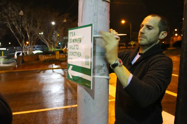 步行 [你的城市]这最初是一个在技术上非法的练习,旨在改善人们在北卡罗来纳州罗利市的街道体验。只是一些简单的标志,绑在灯杆上,位于城市几个关键交叉口,让居民和游客知道在步行距离内可以找到哪些景点和设施,以及步行到达它们需要多少分钟。“游击式导航”是人们对它的称呼。