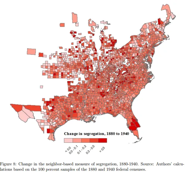 分析发现,1940年黑人家庭与其他种族邻居住在一起的可能性比1880年低25%。而且,这种种族隔离的增加并不仅仅是由于大迁徙到北方或白人逃离,而是在整个美国范围内发生的。无论是增加黑人居民的地区(如城市北部)还是失去他们的地区(如农村南部),在这一时期都看到了种族隔离的增加。