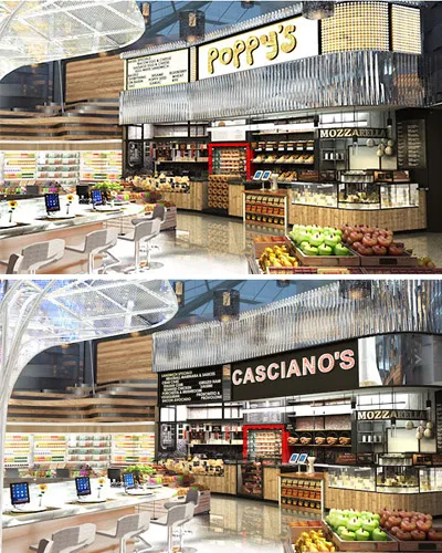 而这里的独特之处在于:旋转标识和滑动墙壁将把早晨的贝果摊转变为下午的意大利熟食店。