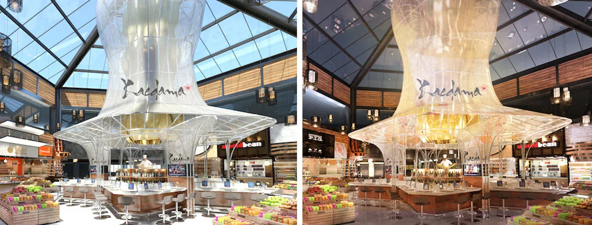 厨师小新·矢浦的Kaedama拉面吧顶部装有嵌入LED灯的金属网,夜间发光。来源:罗克韦尔集团与OTG管理“光是一种元素,创造出温暖的光辉,几乎像一个壁炉,”他说。对于某些地点,设计师通过添加区域地毯增强了壁炉的效果,这在机场是一个不寻常的选择,因为它们比光秃的地板更难清洁。