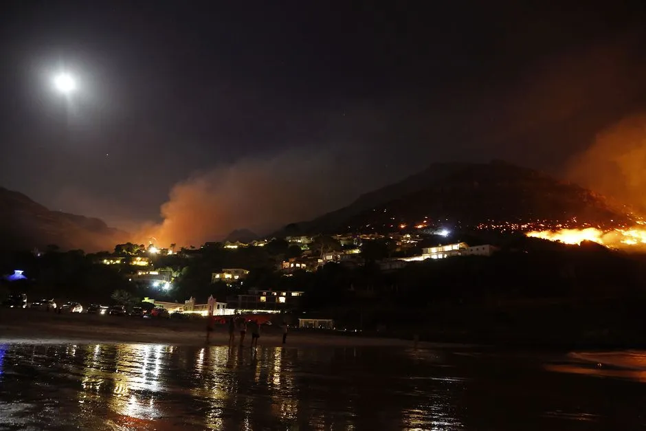 人们站在海滩上观看霍特湾的火灾,位于开普敦的郊区。美联社照片/Schalk van Zuydam
