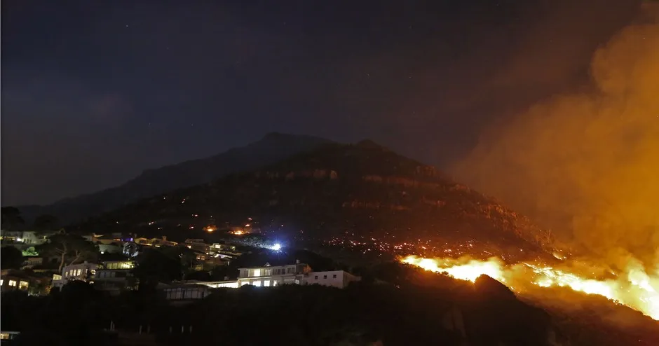 2015年3月4日,野火在开普敦的桌山周围燃烧。美联社照片/Adrian de Kock