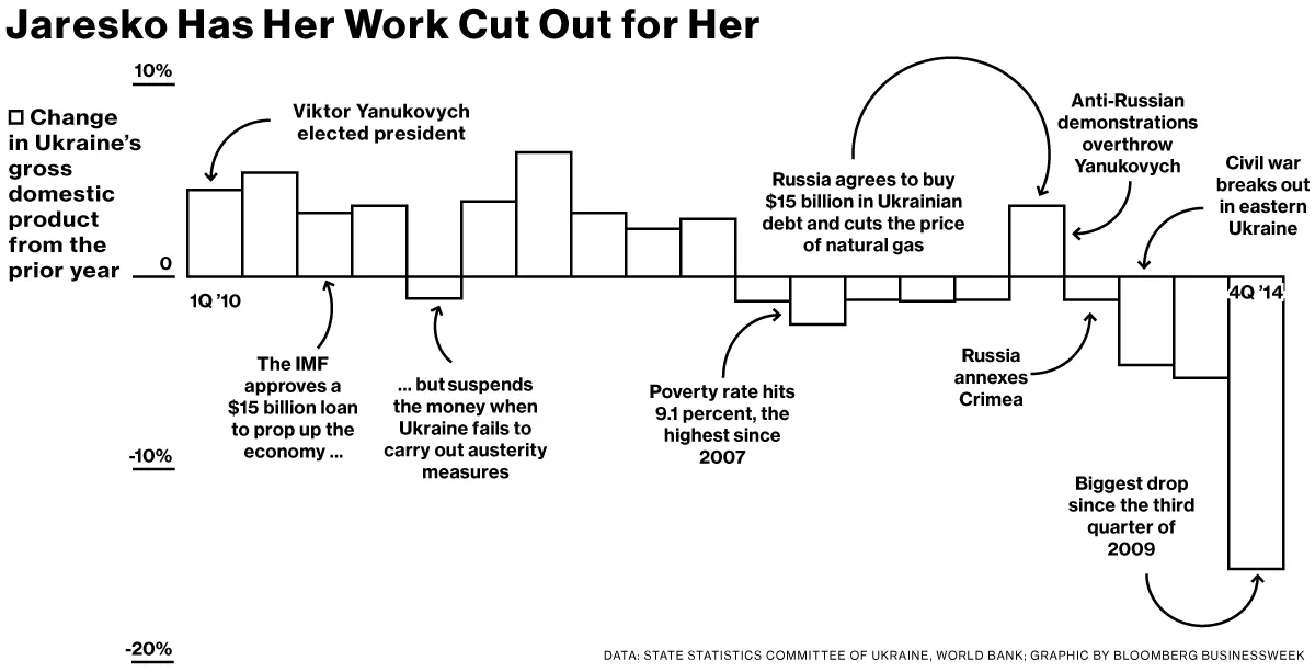 三个月前,49岁的雅雷斯科离开了她在2006年共同创办的私募股权公司,加入了彼得罗·波罗申科的政府。这位亿万富翁巧克力和糖果大亨在被称为“欧洲广场革命”的起义后当选为总统。当时,雅雷斯科甚至没有乌克兰国籍。现在,作为国家的首席经济官,她是乌克兰与世界银行、国际货币基金组织和欧洲复兴开发银行的联络人。税制改革由她负责。国库也是。她必须从零开始构建国家预算。“我不能等待情况变得完美,”雅雷斯科说。