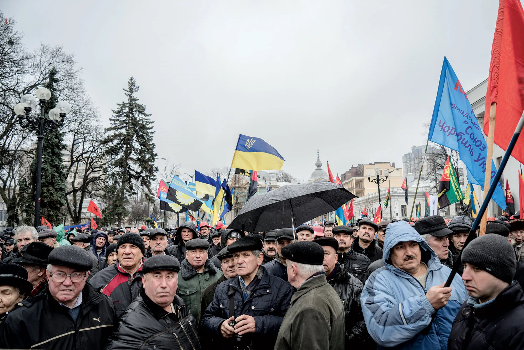 最近在基辅议会前由矿工组织的抗议活动。摄影师:盖·马丁,彭博商业周刊