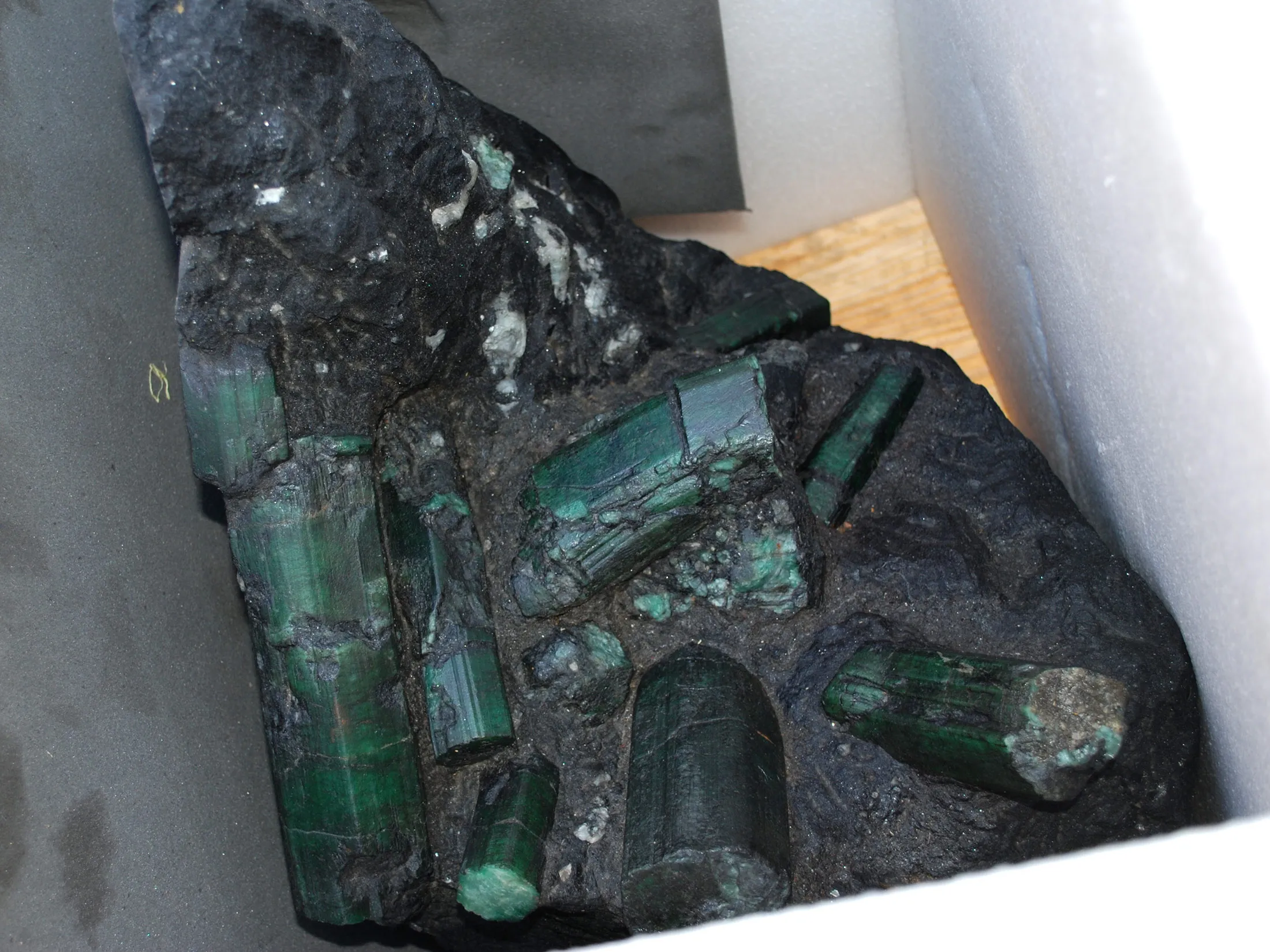 六名员工将箱子抬到千斤顶上,然后将其放到混凝土地面上。阿亚德看着电钻在数十个螺丝上嗡嗡作响。最后,箱子的一侧发出一声闷响掉了下来。阿亚德向前走去,惊叹地凝视着巴伊亚翡翠。在看到一份将翡翠估价为3.72亿美元的评估后,他增加了与伦敦劳合社的保险覆盖。