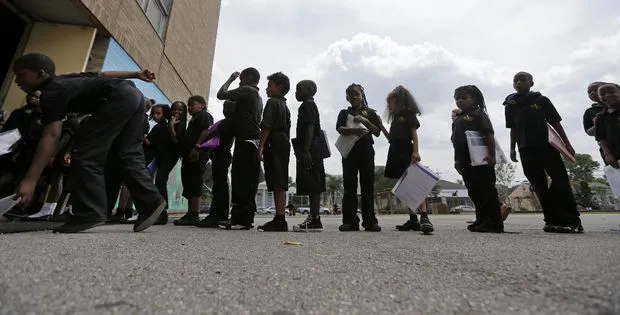 学生们在新奥尔良的 ReNEW SciTech Academy 特许学校排队等候,2014年8月14日,星期四。美联社照片/杰拉尔德·赫伯特”为死者设计:完美的城市公墓," 安娜·克拉克,《下一城市》