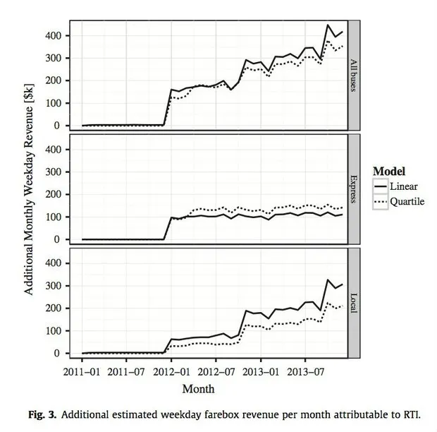到2013年12月,公交时间每月产生约400,000美元的新票务收入。交通研究C部分:新兴技术研究人员强调,这些收入数字只是大致轮廓。例如,如果新乘客主要是持有月票的人,那么总数可能会高估实际收入。另一方面,这些数字仅反映了五个区中三个区的工作日旅行和实时信息——这意味着目前的实际收入增长可能要高得多。