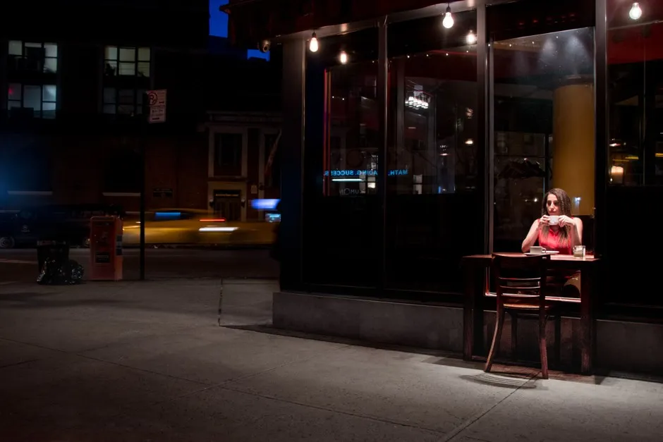 “双人桌”是巴黎出生的艺术家沙尼·哈的一个装置艺术。部分雕塑,部分表演艺术,它挑战那些坐下的人抬起头来,从智能手机上看向朋友、陌生人或自己在玻璃中的倒影。对爱德华·霍普的夜鹰的自觉致敬,这件作品实现了大城市作为孤独、隔离之地的古老概念。