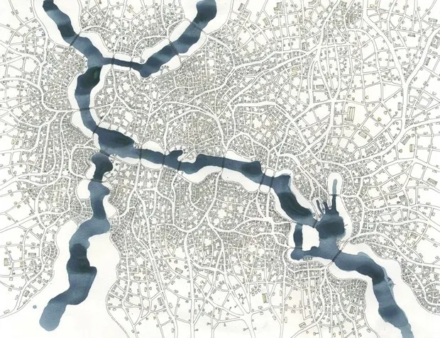 “它们在我绘制时不断演变,”她谈到她的自由形式地图时说。“我认为这与城市在现实生活中的生长方式有关。”