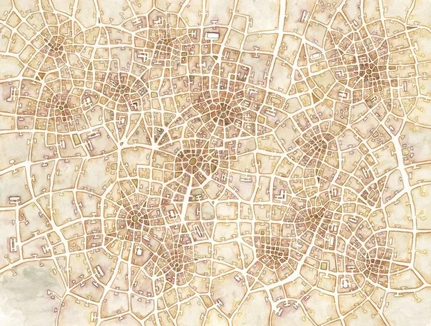 “我的画作并不描绘真实的地方。但人们仍然会立刻将它们视为地图。”加菲尔德将这种可识别性归因于她地图的分形特性——复杂的图案在她的页面角落不断重复,直到无穷大。真实的城市,尤其是那些主要从底部向上发展的城市,从上方观察时往往呈现出分形的形态。