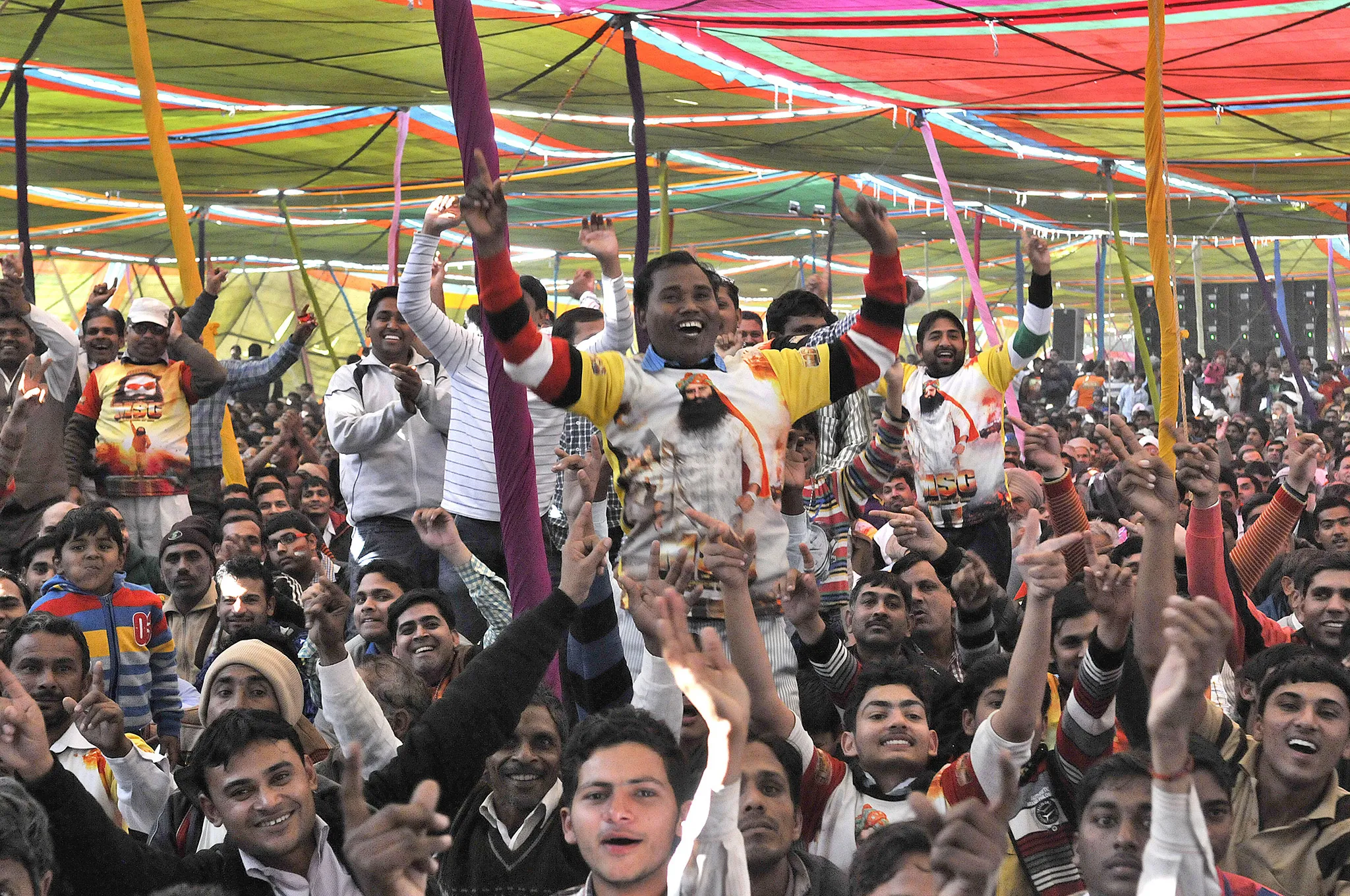 那天在德里郊区的场景是故意设计成马戏团的样子。作为一个拥有数百万追随者的宗教组织的领导者,辛格无论走到哪里都能吸引大量热情的观众。超过10万人挤在一系列帐篷中,覆盖在地铁线路旁的一块土地上。装饰着辛格面孔的肥胖、多彩的气球漂浮在数百英尺的空中。