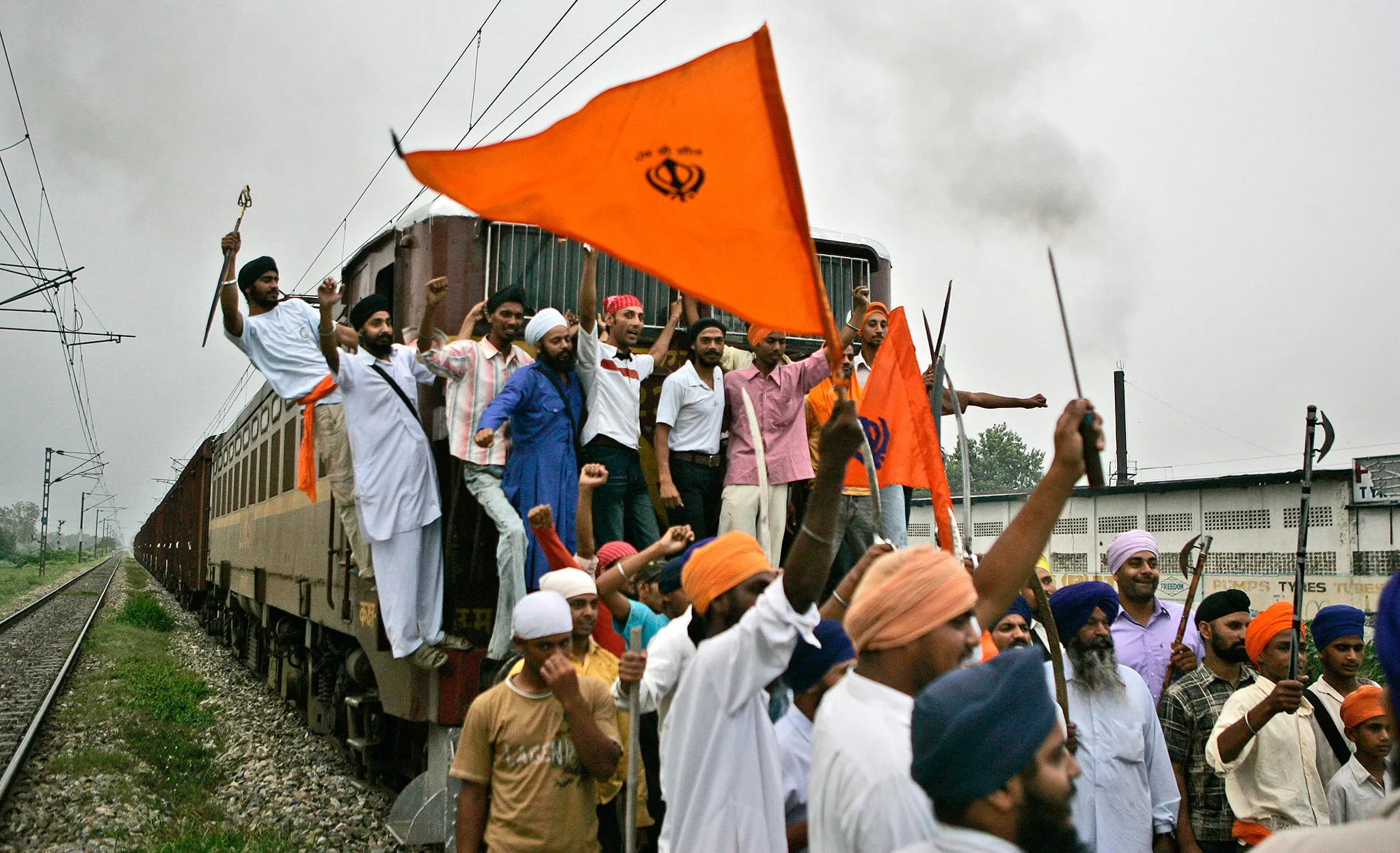 锡克教徒在印度阿姆利则抗议“德拉·萨查·索达”教派领袖辛格时封锁了一列货运列车,时间是2008年6月。