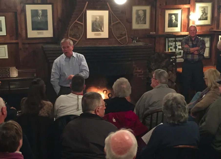 参议员林赛·格雷厄姆在新罕布什尔州康科德的雪鞋旅馆发表讲话,这是他作为可能的总统候选人首次访问该州。