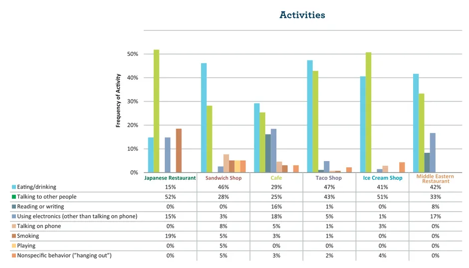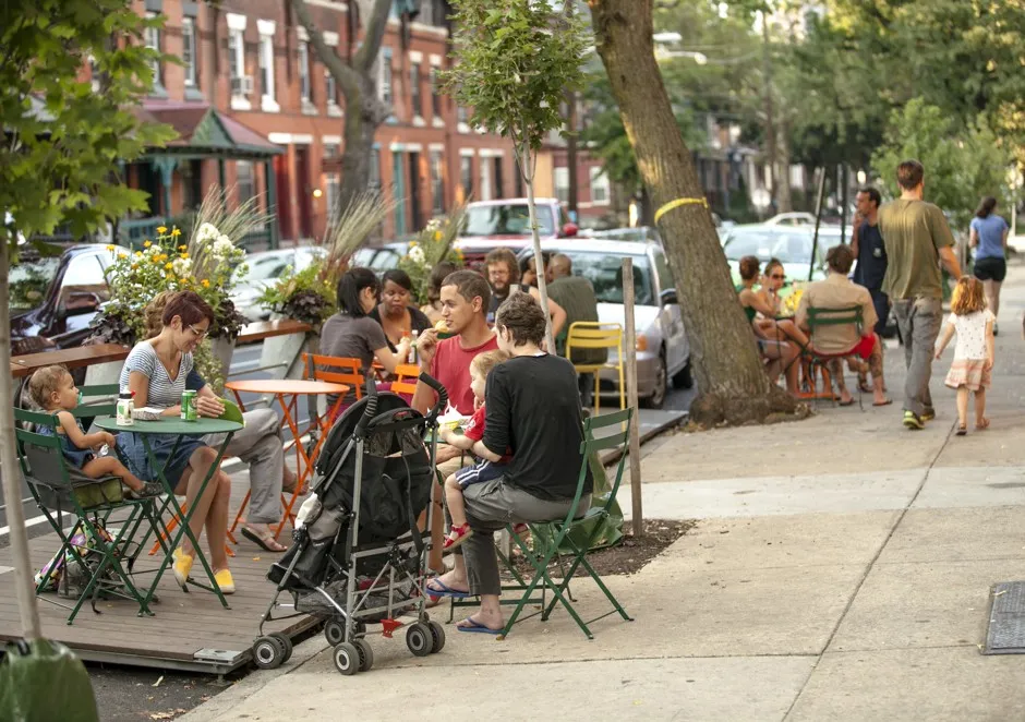 大学城区“把这些事情放在一起,就会出现一些新的东西,”布迪克说。“突然间,邻里里的每个人都停在那里。”大多数费城的公园小区位于餐馆外,吃饭、喝酒和与他人交谈是最常见的活动。在一个位于咖啡馆外的例子中,阅读或写作等更孤独的活动更受欢迎。