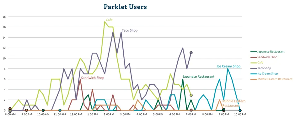 研究还发现,公园小区吸引了大致相等比例的男性和女性,这一统计数据表明它们是安全和受欢迎的空间。而且,20%到30%的用户并不是邻近商家的顾客,这回应了关于公园小区的创建是否会将街道空间从公共领域转移到私人企业的担忧。