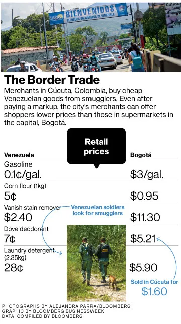 在靠近边境的一家商店里,一瓶50克的多芬除臭剂,由联合利华在墨西哥生产,售价为4,000比索(1.60美元)。它上面盖有17.58玻利瓦尔的法定价格印章,按非正式汇率约为7美分。在波哥大的一家超市,同样的产品,按照合法方式运输和处理,售价为13,670比索。一袋1公斤的玉米面,标有“仅在委内瑞拉出售”和其规定价格12.4玻利瓦尔(约5美分)的印章,在市场上售价为1,900比索(72美分)。“这里的所有农产品都是委内瑞拉的,”一位不愿透露姓名的肉贩说,因为他出售走私肉。