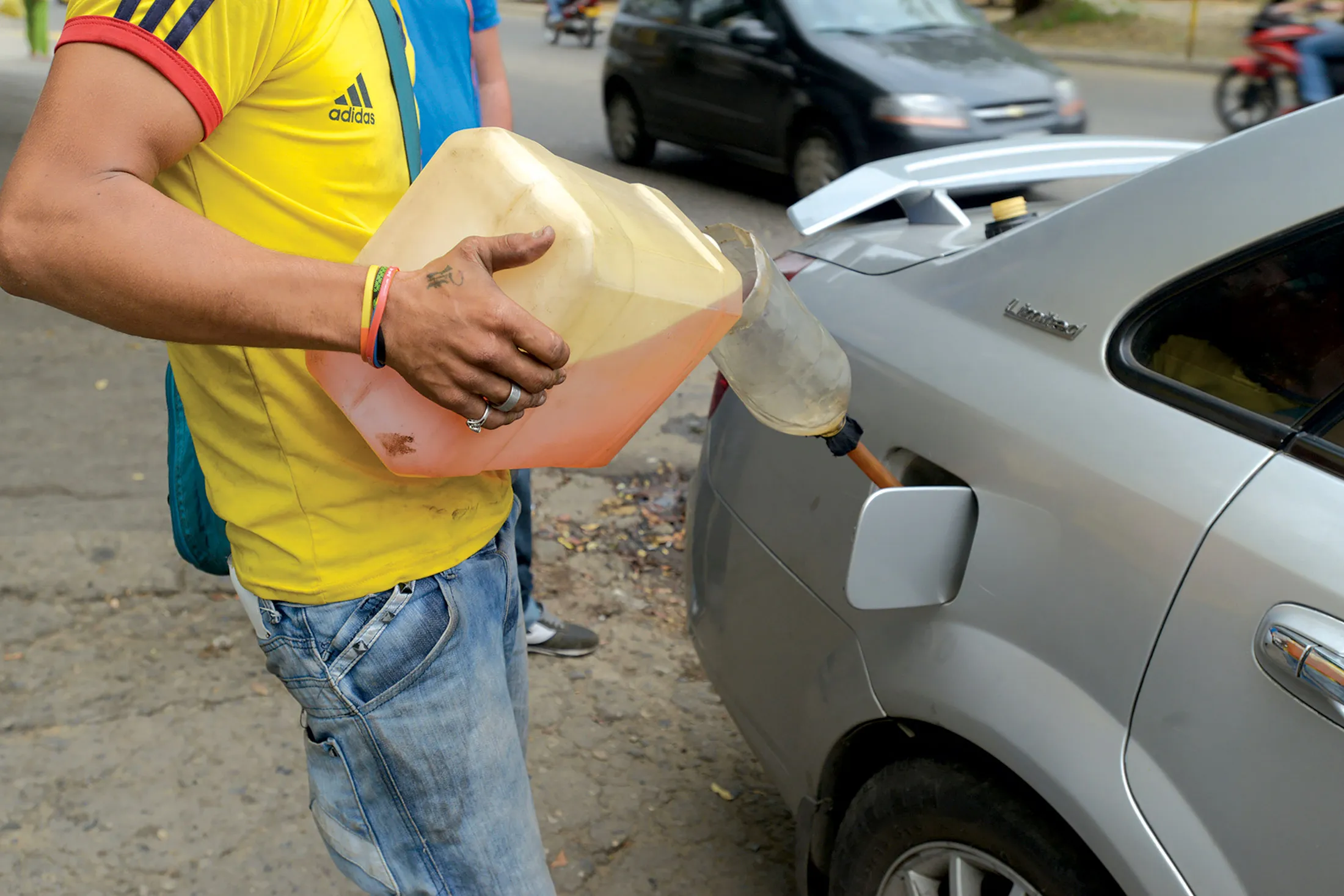 汽油价格为6000比索,或每加仑2.30美元。摄影师:阿莱汉德拉·帕拉(Alejandra Parra)/彭博社走私燃料在临时加油站公开出售。根据一位不愿透露姓名的汽油销售商的说法,打击行动提高了贿赂成本,因为他的工作是非法的。他躺在路边的吊床上,周围是汽油罐。当一辆车停靠时,他将走私的汽油抽入油箱。由于在委内瑞拉燃料几乎是免费的,最大的成本是贿赂边境两侧的官员,以及支付控制穿越边界的土路的哥伦比亚黑手党和游击队的费用。一趟走私可能需要八次贿赂。