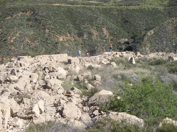 探险者站在大坝遗址的西侧。Flickr/孔拉德·萨默斯与此同时,波拉克忙于组织这个时候出现的各种圣弗朗西斯相关活动。他一直在更新协会的 网站,提供最新的地方研究,计划在14日进行一次前往遗址的巴士之旅,并且在3月28日他将共同主持一个研究 研讨会,邀请 J. 大卫·罗杰斯,一位法医土木工程师,他提出了最新的模型来解释大坝的崩溃。